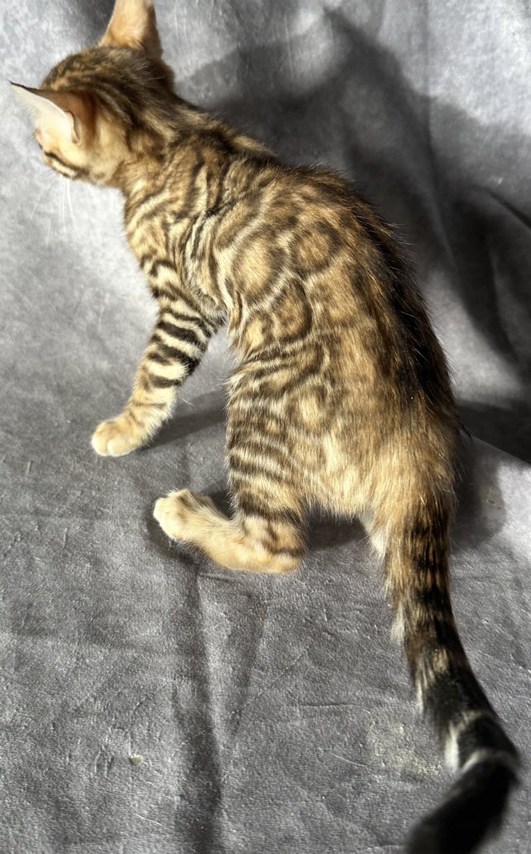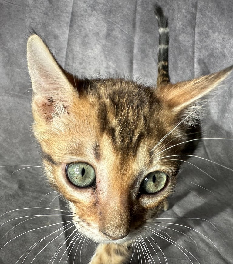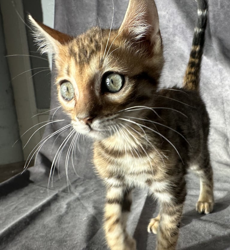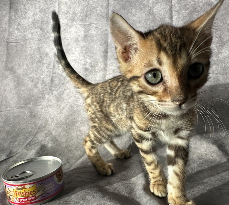 Meet LEOPOLD! He is a Brown Bengal with Green Eyes. He was born on 11/29/2025 and is available and ready to go to his forever home now! He is very healthy and has been dewormed and has had his first round of shots. He is very active and sweet! His father is registered with TICA and his mother is bred from TICA registered parents although I do not have a registration on his mom so therefore this kitten does not include TICA papers but anyone that knows anything about Bengals can clearly see he is 100% Bengal. Because I do not have TICA papers I am selling this beaitiful boy Bengal for only $1,200 instead of the $2,500 I would normally sell a Bengal such as this one for.